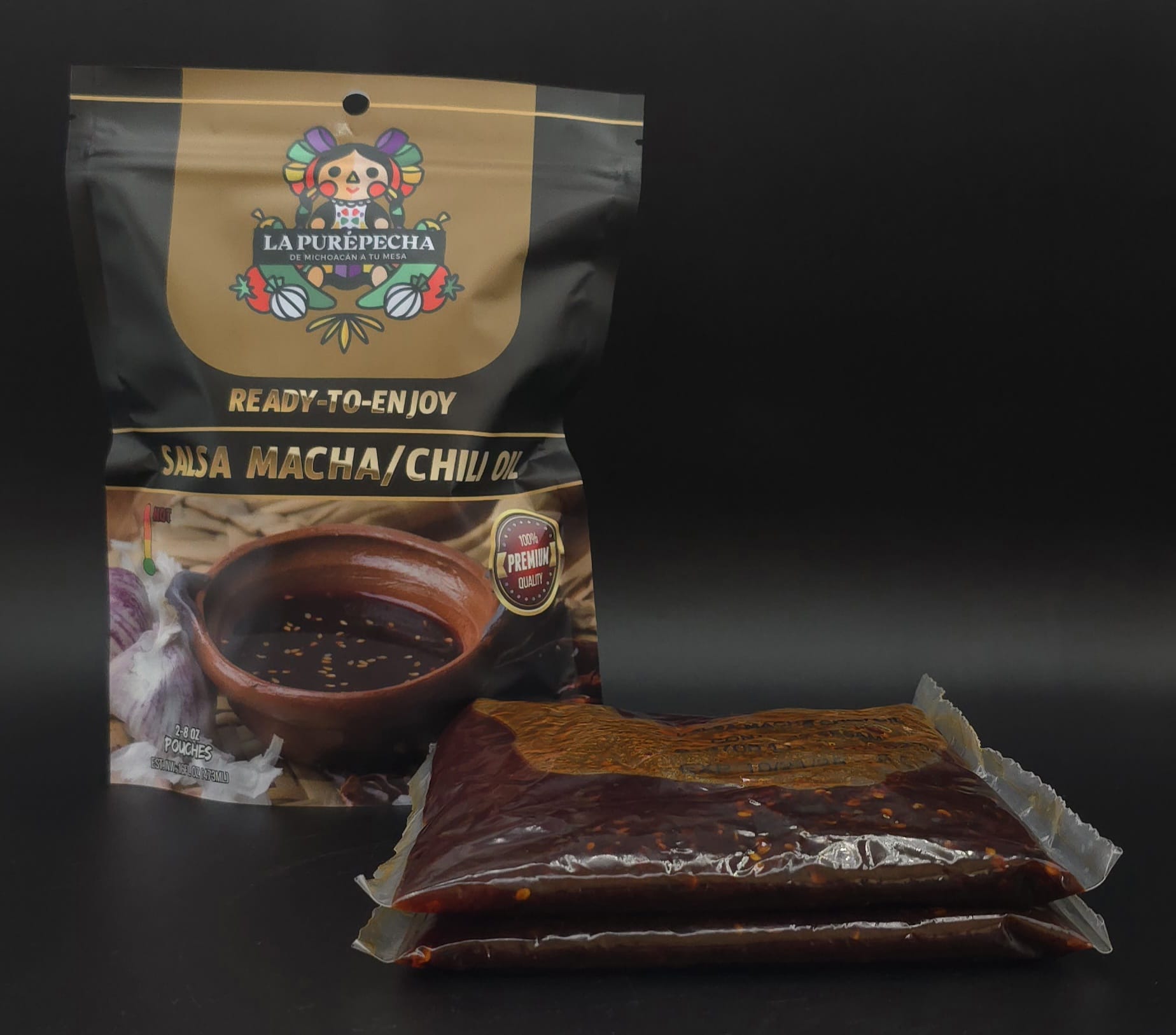 Paquete individual de Salsa Macha que incluye 2 sobres de 8 oz, cada uno lleno de sabor ahumado, intenso y con el picante perfecto.